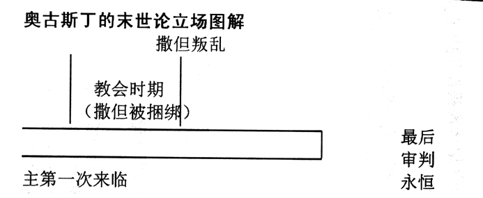 從《上帝之城》(The City of God)的內容顯示,他不相信地上有千禧年王國。所謂千禧年,就是指主道成肉身後至撒但背叛前這一段期間。而道成肉身後是教會時期開始,撒但在十字架救贖成就時巳被捆縛;國度是屬靈的;他相信人會有肉身的復活;他的末世論可說是「無千禧年派」立場;他視教會即以色列。