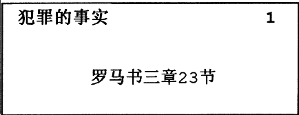 1 背頌經文:羅馬書三章23節(請把它完整地寫在小卡片上隨身攜帶,在空餘時間把它背熟。給它標題為:罪的事實。背頌經文時連把出處也一同背誦。)