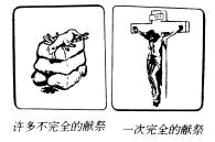 數千年以來,人們一直照著神的吩咐將祭牲獻為供物。這些祭牲的血並沒有除掉獻祭之人的罪。這些祭牲只不過是基督代世人而死的預表罷了。舊約時代人們所獻的許許多多祭牲,都是指基督一次在十字架上所獻的祭。