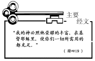 主要經文: 「我的神必照他榮耀的豐富,在基督耶穌裡,使你們一切所需用的都充足。」(腓四19)