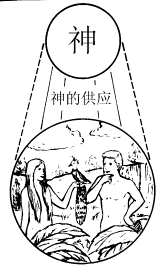 劃一個圈代表神為亞當和夏娃提供的世界。在他們的世界裡,亞當和夏娃擁有他們所需的一切。假如他們還需要別的東西,神一定已經提供了。亞當和夏娃實在是可以說: