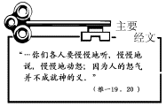 主要經文: 「…你們各人要快快 地聽,慢慢地說,慢慢地動怒;因為人的怒氣並不成就神的義。」(雅一19-20)