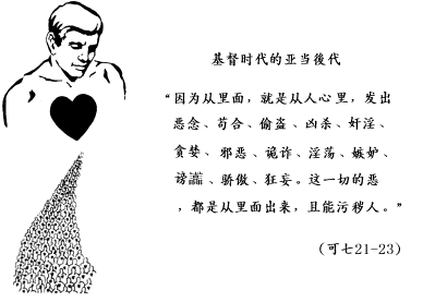 “因为从里面,就是从人心里,发出恶念、苟合、偷盗、凶杀、奸淫、贪婪、邪恶、诡诈、淫荡、嫉妒、谤讟、骄傲、狂妄。这一切的恶,都是从里面出来,且能污秽人。”(可七21-23)