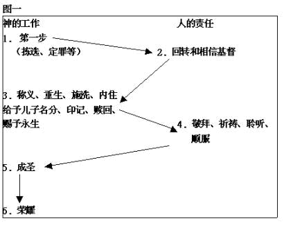 下一章,我們將詳細研究獲救贖的人及救贖的教義。現在,先整體看看神救贖的計劃。在按部跟從這六個步驟時,請參看本頁圖一。