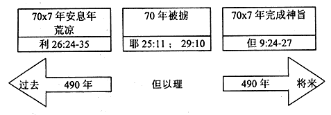 (1) 但以理一直盘算着“七十”年被掳的期限,他的注意力集中在“年”上。 D.K. Campbell 谓但以理视以色列七十年被掳期是选民因荒弃了没有遵守七十个安息年而导致的(参耶 25:11, 12 ; 24:10 ;代下 36:21 ;利 26:33-35 )。换言之,选民国在过去 490 年内没有遵守安息年,现今但以理看见在前面亦有 490 年之久神便会在选民国身上完成他的计划,参图析如下:(注 29 )