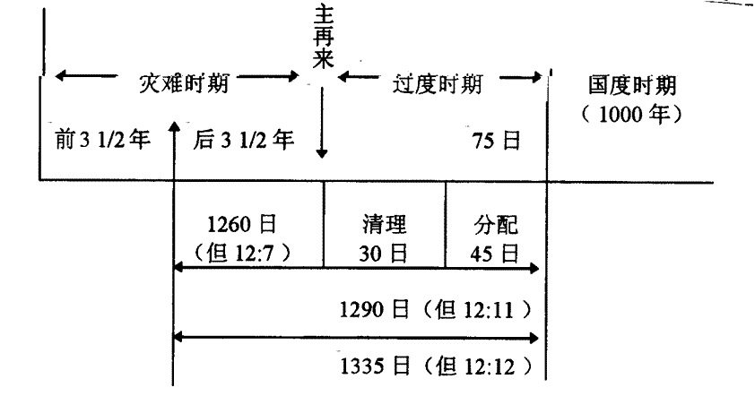 弥赛亚在地上的国度是一个神治国度,既在地上,故必有地土与领域(国土);再且这个治国度包括政治与宗教的部分,这是地上最完全国度的楷模,政权是公义无伪的,宗教是道德无邪的,是神应许给大卫那复兴国度的应验,这国度的建立需时分配管治的部门,如地上新始的国家政府在立国时所必有的各种行政机关,地理国界的制定(参创 15:18 ),所站的岗位,所拥有之权力等的需时间安置,故额外的 45 日不算太长,亦非太短,所以由灾难期结束后( 1260 完结)先有 30 日的“清理”(非如有人将之作恩典时期,如给犹太人悔改机会),再有 45 日的“分配”或“赐福”,合共 75 日之期,是为“过度时期”,如下面图析: