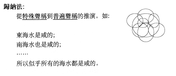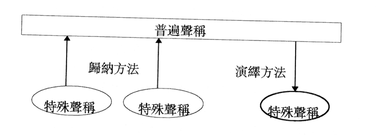 从普遍声称到特殊声称的推演,使用三段论。例子如上。
